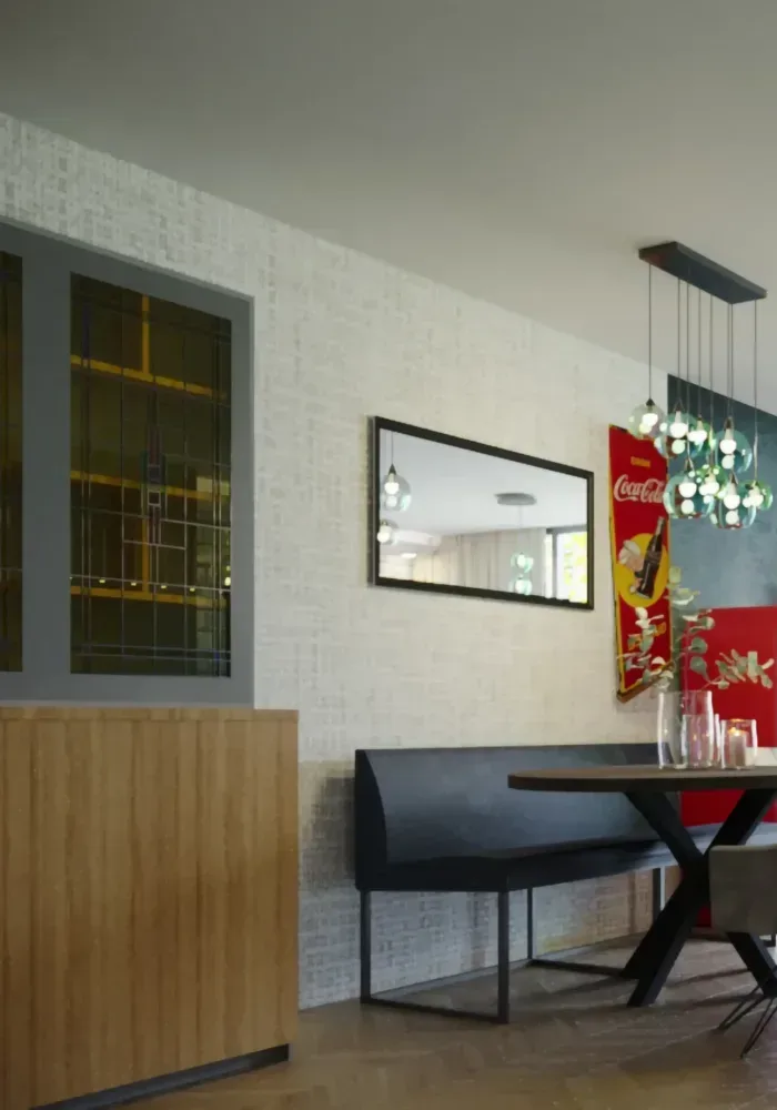Wij recyclen graag bestaande elementen uit de architectuur in onze ontwerpen. Een fantastisch voorbeeld hiervan is het omzetten van oude ensuite deuren tot een stijlvolle servieskast. Dit vermindert niet alleen de behoefte aan nieuwe materialen, maar voegt ook karakter toe aan jouw ruimte.